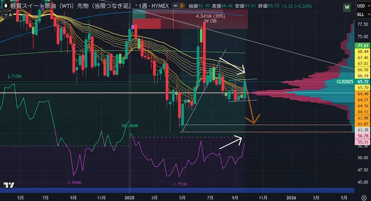 2025年9月第4週までの原油価格の環境認識は、シンメトリカルトライアングルのブレイクアウトから、リターンムーブで一旦ブレイクしたラインに戻る定番ともいえる動作をしはじめていると考えています。