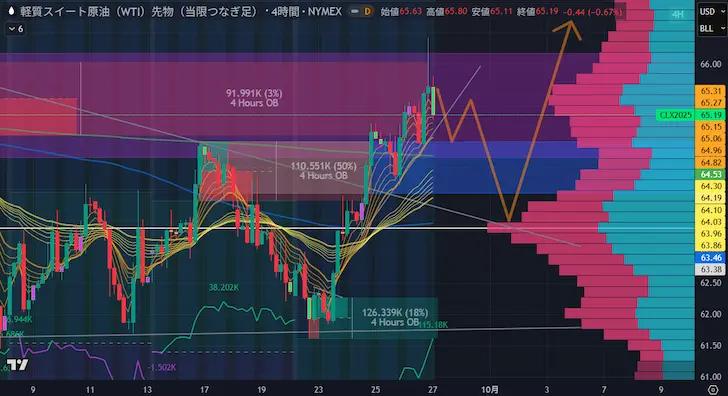 2025年9月第5週の原油価格は、シンメトリカルトライアングルのブレイクアウトから、リターンムーブで一旦ブレイクしたラインに戻る定番ともいえる動作をしはじめていると考えています。