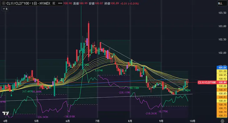 現在の原油先物のスプレッドチャートは、見たこともない吹き上げ方から急落したあと、一貫して低下していましたが、9月のFOMCで利下げが決定してから上向きに方向性を変えています。