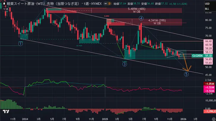 2025年12月第4週までの原油価格の環境認識は、2023年9月末から続く下降トレンドが続いており、イスラエル-イラン紛争で急騰した例外的な動きを除いて一貫して弱気相場が続き、ようやく最終的な下降衝撃波W5を迎えるという認識です。