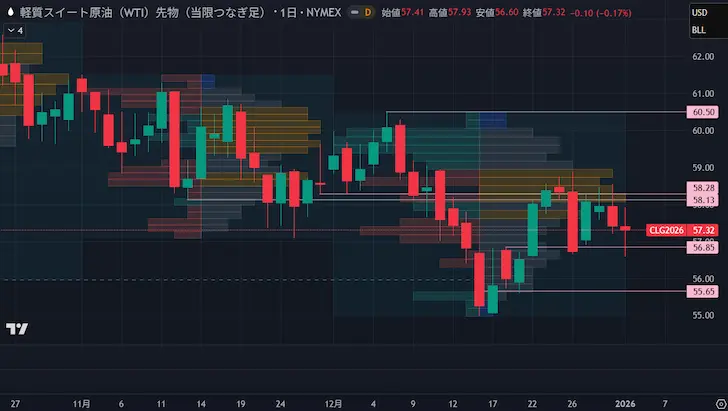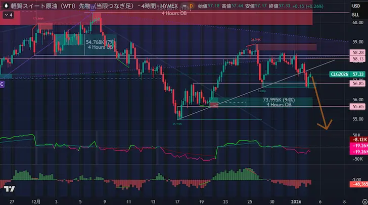 ファンダメンタルズでは、1月4日のOPEC+オンライン会議で低迷する原油価格を前に2026年度第1四半期の増産停止がコンセンサスですが、これが減産に転じる場合は、これまでの劣勢を覆して上昇してくる可能性があります。