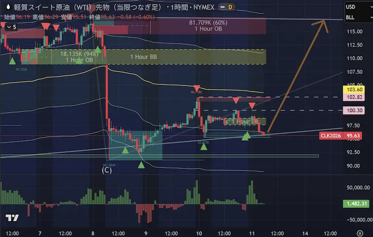 4時間足レベルのオーダーブロックは範囲が広すぎて実際のエントリーには不向きなため、より精密なポイントを探るべく、「WTI原油1時間足2026年第2四半期第2週」のチャートで内部構造を確認します。