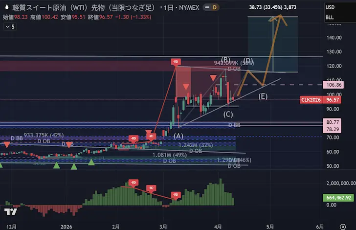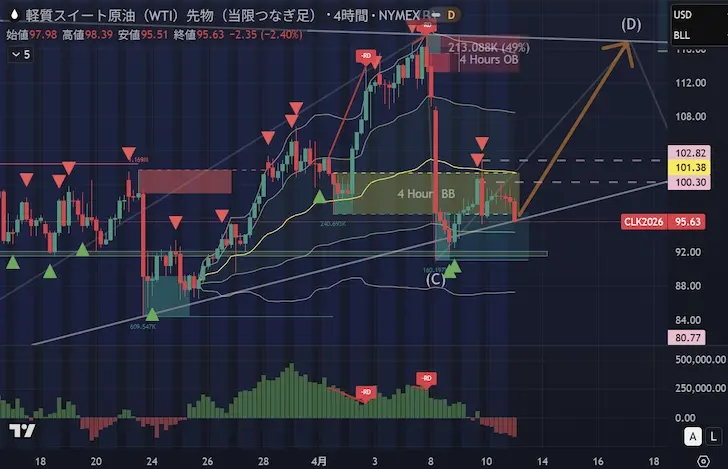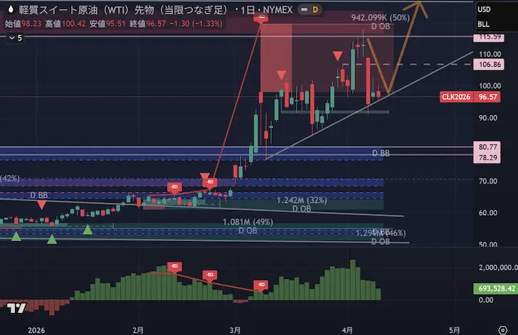 イスラマバード会談の「合意ゼロ」という事実を受け、4月13日(月)のNYオープンでは、金曜終値近辺(96.5〜97ドル台)から+4〜5%という強いギャップアップ(97〜100ドル台スタート)となる公算が高いと見ています。
