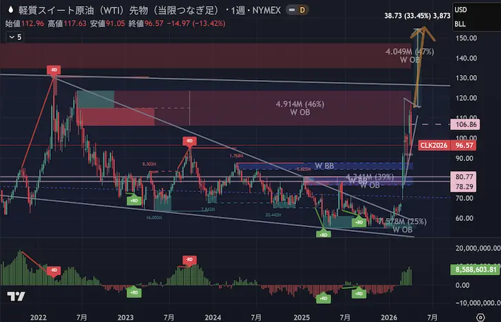 今週のWTI原油相場は、市場が過剰に織り込んでいた「偽りの平和(停戦)」が完全に崩壊したことで、ショートスクイーズ(暴騰)を再開し、トライアングルの上値抵抗線116~117まで戻る展開が濃厚です。