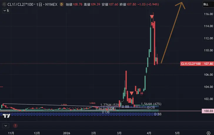 4月21日の5月限の決済期限が迫る中、この102.7ドルの防衛線を上抜かれた瞬間、売り方の買い戻しがパニック的に連鎖します。