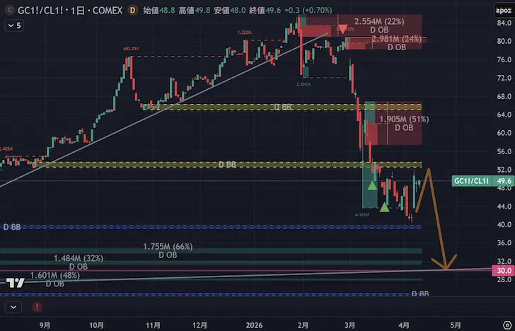 先週は当局の介入と価格操作により原油価格が急落したため、多少戻っていますがおそらく30付近まで金/原油比率は下落するはずです。