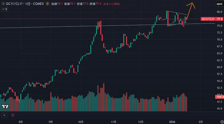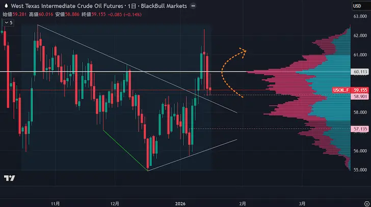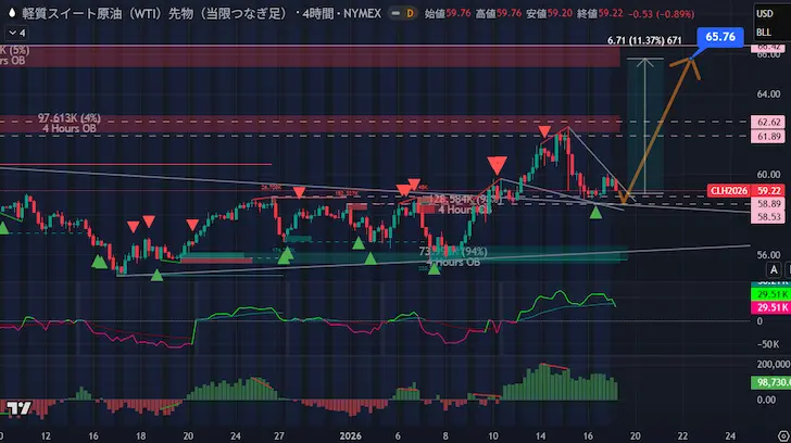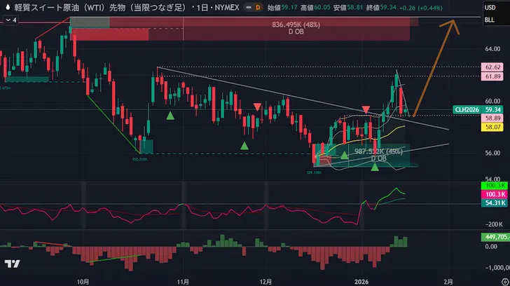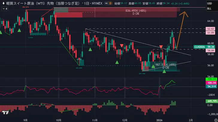 2026年1月第2週までの原油価格の環境認識は、2023年9月末から続く下降トレンドが続いて、急落するリスクがつきまとっていましたが、底値圏で形成されたトライアングルを上方向にブレイクしたことで逆方向への価格の見直しが進むと考えています。