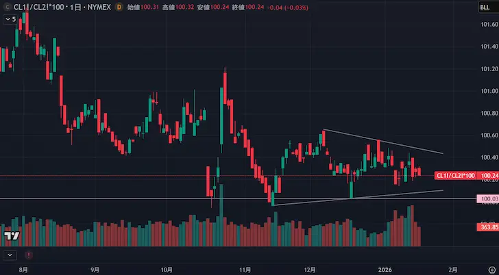 原油先物の期近と期先とのスプレッドは、需給状態を端的に表しており、Trading Viewでチャート化するとさらに状況判断がしやすくなりトレードに役立てることができます。
