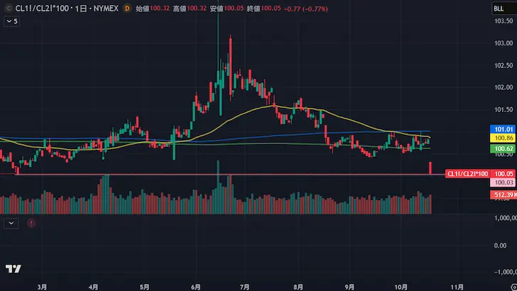 スプレッドチャートが限月交代で急落して100という心理的な節目に接近していますが、12月限まで急峻なバックワーデーションになっています。