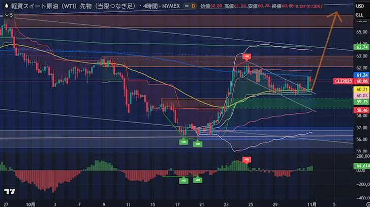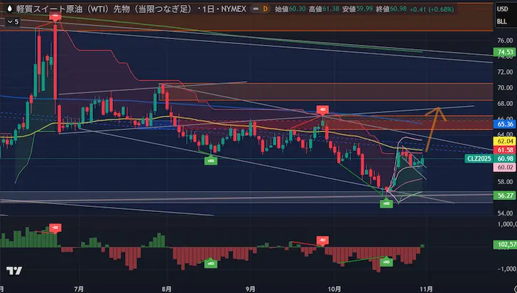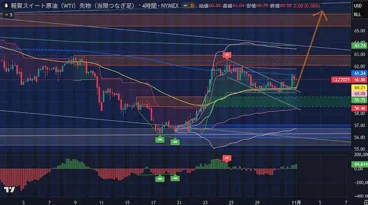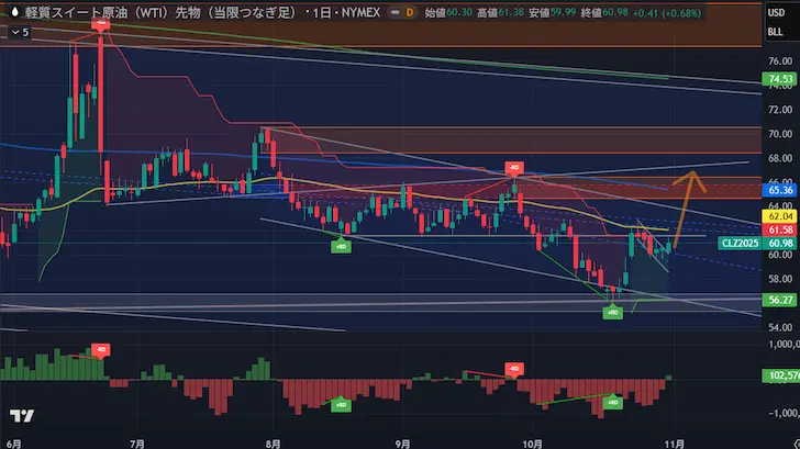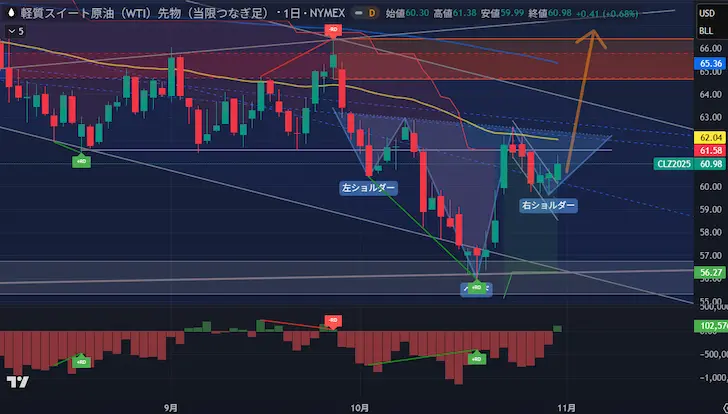 先週の2025年11月第1週の原油価格の見通しは、伝統的な底打ちパターン「逆ヘッド&ショルダーズ」が形成されて上昇トレンドが発生するというシナリオが誰もが認識する流れだと思います。