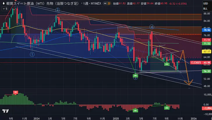 WTI原油を週足で観察すると2023年9月から高値・安値を切り下げながら下落トレンドが進行しています。