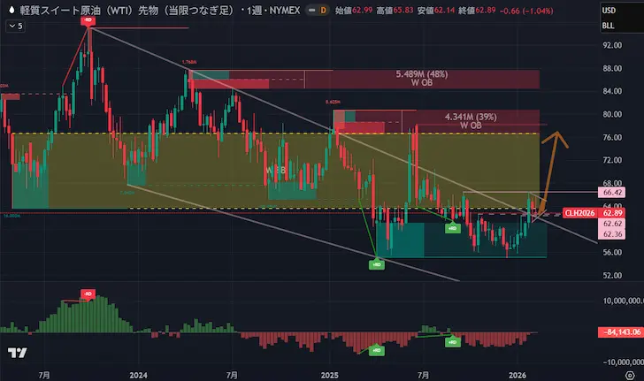 先週の2026年2月第1までの原油価格の現状は、2022年6月から続く強力な下降トレンドを突破した可能性が指摘できます。