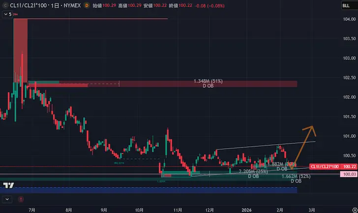 原油先物の期近と期先とのスプレッドは、需給状態を端的に表しており、Trading Viewでチャート化するとさらに状況判断がしやすくなりトレードに役立てることができます。