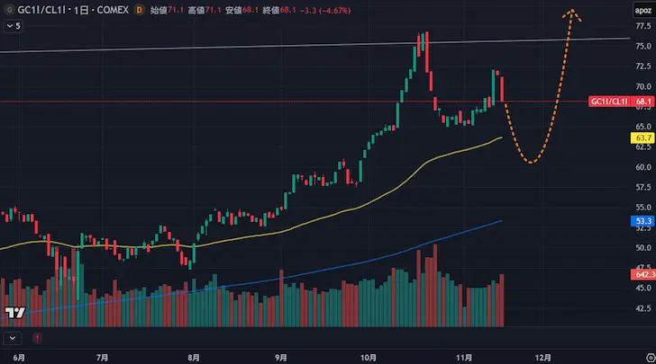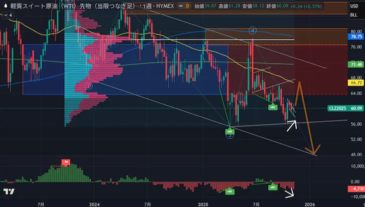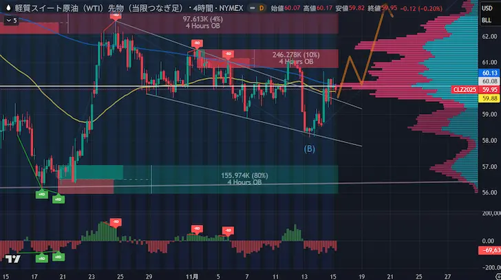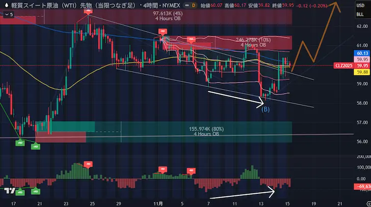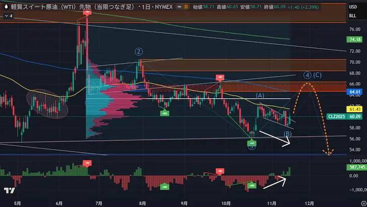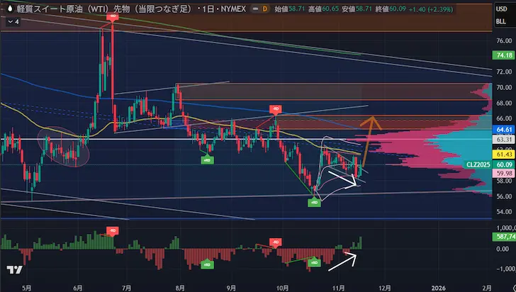2025年11月第2週の原油価格は、予想以上に逆ヘッド&ショルダーズの右肩形成に時間がかかっています。