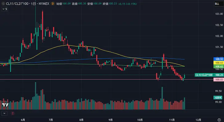 10月22日~10月23日の急騰後、ズルズルとコンタンゴが進んでいたのですが、ここにきてようやくスプレッドが反発し、これまでの膠着状態を上回る出来高で引けています。