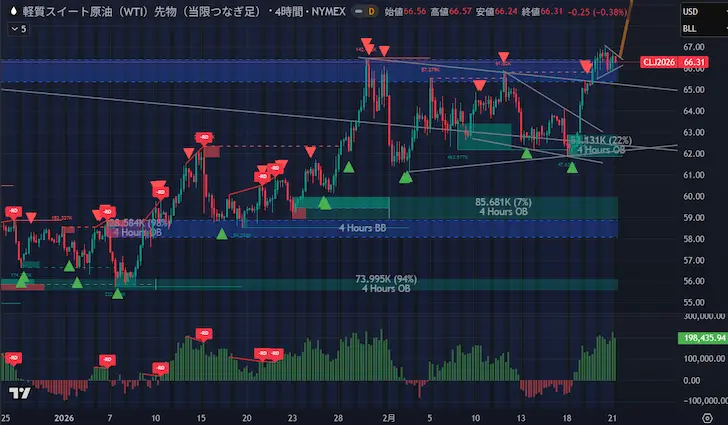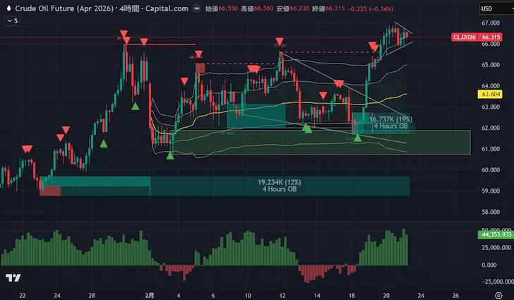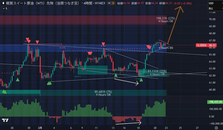 2026年2月第4週の原油価格は、急上昇の後、トレンド継続を示唆する強気ペナントをブレイクアウトしました。