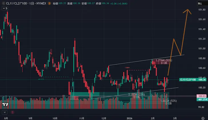 原油先物の期近と期先とのスプレッドは、需給状態を端的に表しており、Trading Viewでチャート化するとさらに状況判断がしやすくなりトレードに役立てることができます。