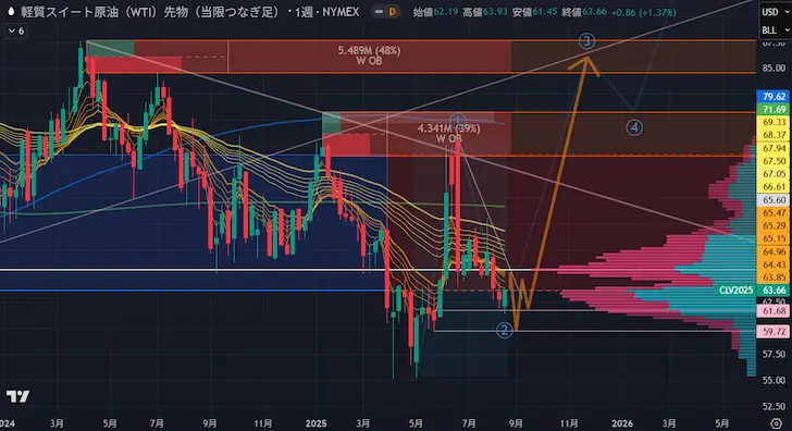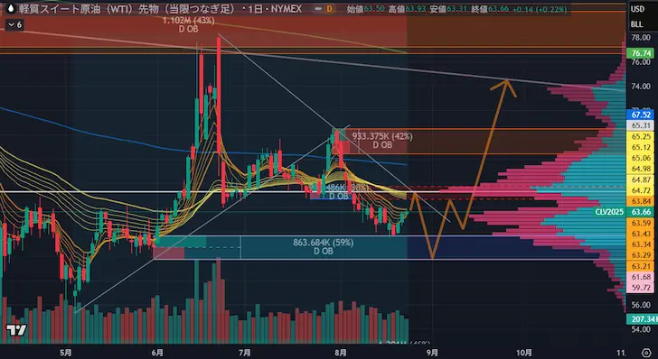 今週保有したロングポジションは、週をまたぐため決済しましたが、来週の基本路線は日足62EMA(黄太線)と価格帯別出来高が最も大きい65ドル半ば付近まで買い目線でポジションをとり、それ以降は60ドルを割れるレベルまでショートしたいと考えています。