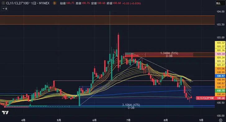 現在の原油先物のスプレッドチャートは、見たこともない吹き上げ方から急落したあと、一時持ち直しする動きを見せていましたが、再び低下し需給が弱まっていることを示しています。