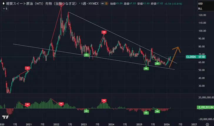 日々飛び交うニュースで価格が上下に振らされると見失いがちですが、長期チャートを見ると、数年にわたって原油価格の上値を抑えつけてきた強固な「下降ウェッジ」がすでに明確にブレイクアウトされていることが確認できます。