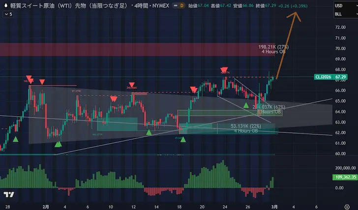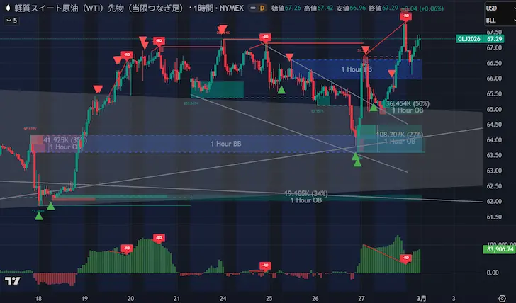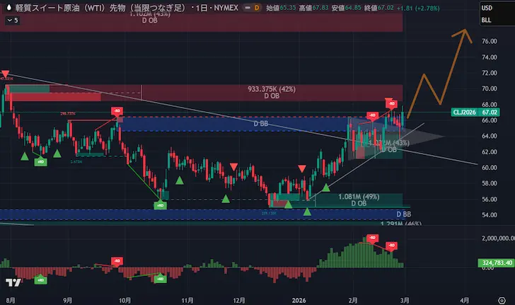 今回の記事では、歴史的な軍事行動を受けた日足のプライスアクションと今後のターゲット「77ドル」へのシナリオ、そして何より「ニュースで乱高下しようとも、長期で見れば原油は極めて強気である」ことを証明する週足の「下降ウェッジ」について詳しく解説していきます。