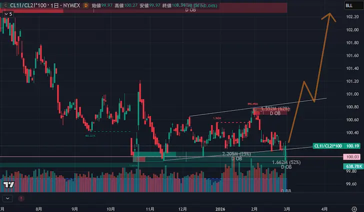 原油のファンダメンタルズ分析は、先物における期先・期近とのスプレッドをTrading Viewで複合チャートにすると視覚化できます。