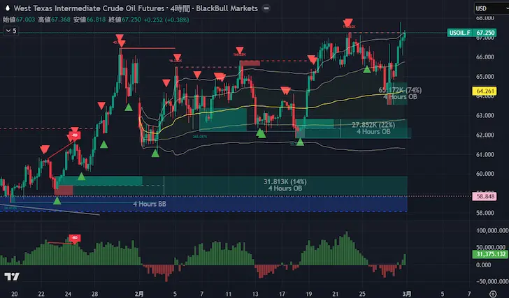 したがってブレイクすれば価格は走るはずですが、原油価格の場合はアメリカ・イラン間の軍事的な緊張の中でさらに膠着を求められ、最終的な会合となった2月26日のジュネーブ会合で和平の期待から、もう一度流動性を確保すべく下押ししています。