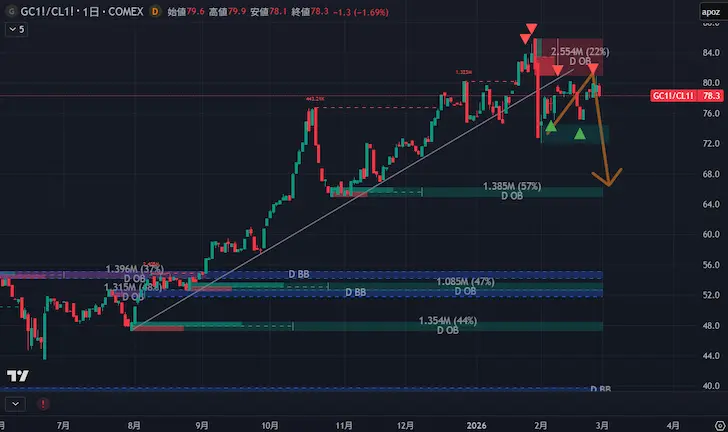 現在の原油価格では、以前の下落トレンドの最後の高値で形成されたオーダーブロックが一発で突破されたことで、これがブレイカーブロックに転換し、強力なサポートになっています。