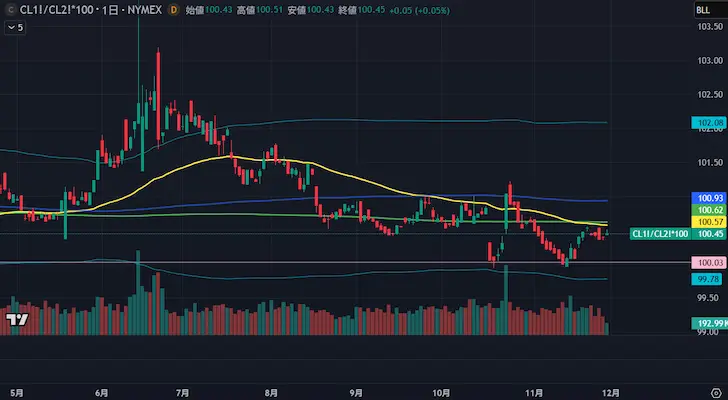 原油先物の期近と期先とのスプレッドは需給状態を端的に表しており、Trading Viewでチャート化するとさらに状況判断がしやすくなりトレードに役立てることができます。