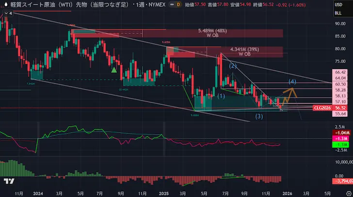 これまで原油価格は、2023年度9月から2025年11月まで原油価格は地政学リスクで急速に吹き上がる場面はあっても、基本的には徐々に高値・安値を切り下げて低下していくプロセスを経ています。