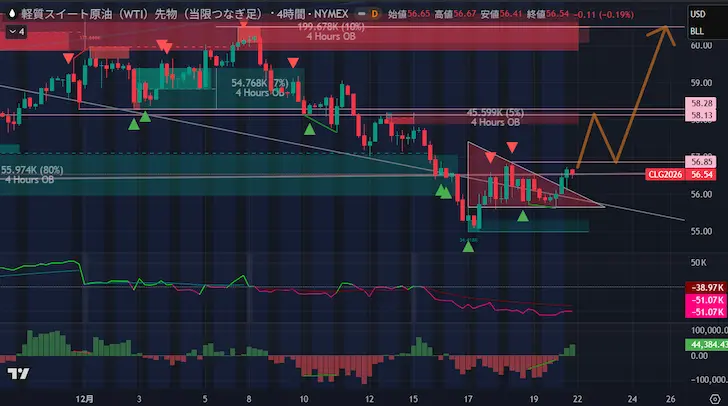 これで12月18日の高値56.85を明確にブレイクすれば、58.13前後のオーダーブロックまで上昇が期待でき、それも上抜けると60ドルレベルまで上昇余地が広がります。