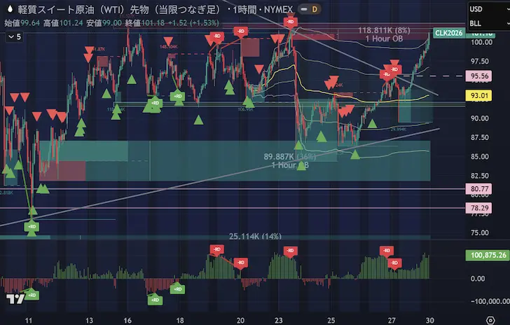 相場に「絶対」はありません。だからこそ、下で待つ「95ドル台」と、上抜けを確認する「101〜102ドル突破」の2つの網を張り、市場がどちらの答えを出しても安全かつ確実に利益を最大化できる準備を整えておくことが、現在の乱高下相場で生き残る唯一の手段です。