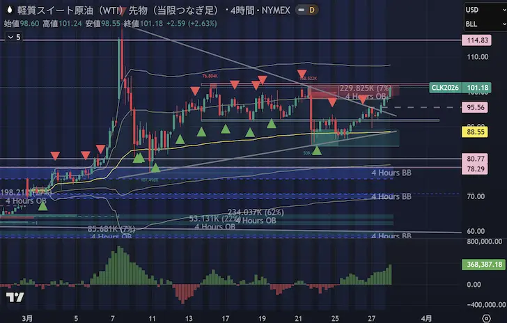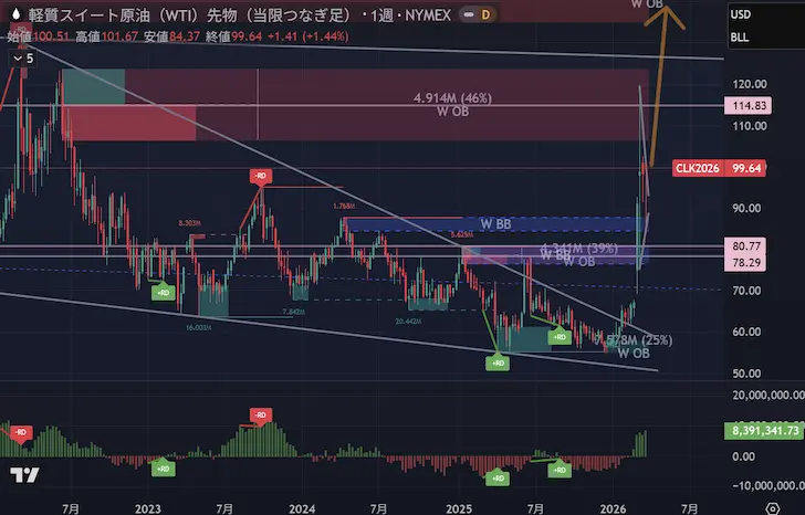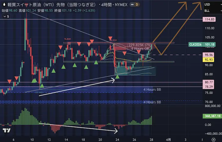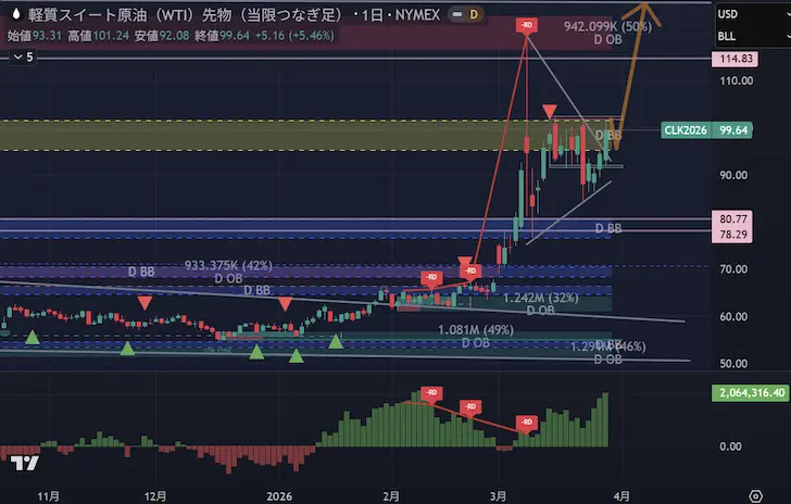 米国の生産増加が見込めず、ホルムズ・紅海のダブル封鎖リスクが現実的である以上、テクニカル分析で提示した「92〜102ドルレンジへの上抜け(蓄積フェーズのブレイク)」が今週のメインシナリオとなります。