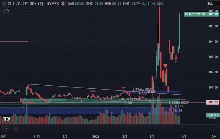 原油先物の期近と期先とのスプレッドは、需給状態を端的に表しており、Trading Viewでチャート化するとさらに状況判断がしやすくなりトレードに役立てることができます。
