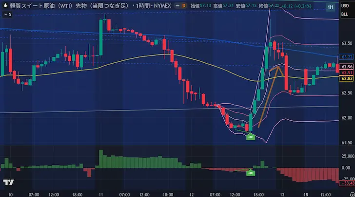 CVDが新高値を更新したものの価格が高値更新していない場合で、原油価格では弱気シグナルはダイバージェンスで出現することが多いものの、弱気リバーサルは1時間足では時折ありますが日足で観測されることは稀です。