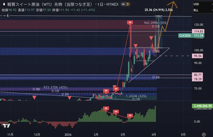 すなわちエネルギーを限界まで溜め込んだWTI原油は、ついに大口が価格を垂直に引き上げる「マークアップ(吊り上げ)」フェーズへと本格的に移行し始め、123~127ドルへの短期目標に向けて急速に上昇するシナリオです。